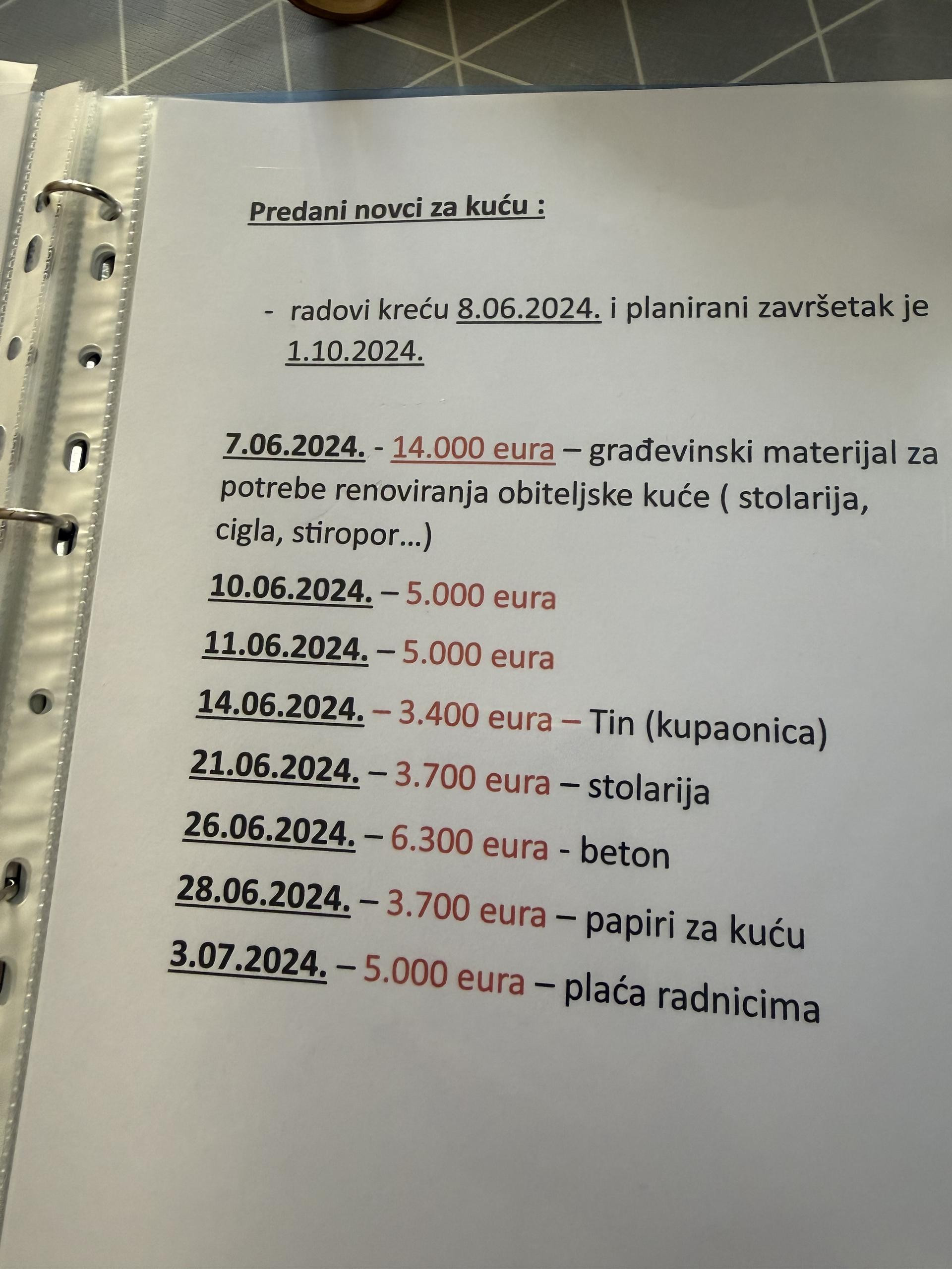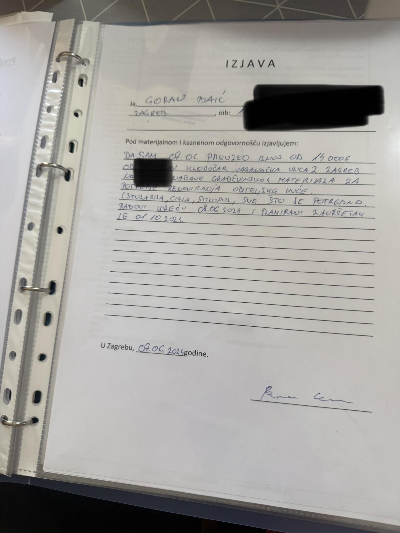 U izjavi koju nam pokazuje, a koja je ovjerena kod javnog bilježnika, Goran Baić navodi sljedeće: - Pod materijalnom i kaznenom odgovornošću izjavljujem: da sam 7. lipnja 2024. preuzeo iznos od 14.000 eura od T. Klobučar (brata spomenute sugovornice) na ime nabave građevinskog materijala za potrebe renoviranja obiteljske kuće (stolarija, cigla, stiropor... sve što je potrebno). Radovi kreću 8. lipnja 2024. i planirani završetak je 1. listopada 2024. godine.
